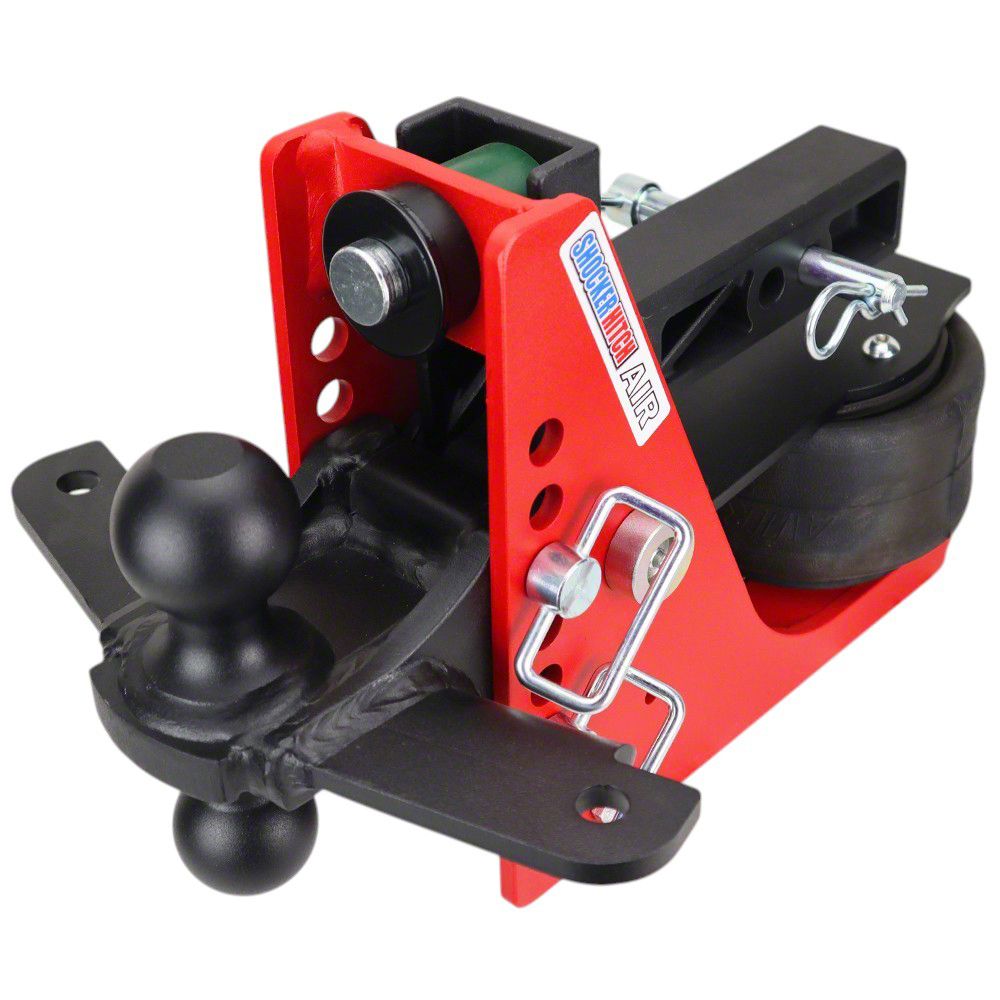 Add instant air ride to your pickup and trailer. This sway control Shocker air ride hitch absorbs the road shock and bumper naturally reducing the tendency of trailer sway and the combo ball with sway tabs allow for additional sway control. This Shocker Air Hitch has a red combo ball mount with sway bar tabs is made for the basic sway control arm / bars with mini hitch ball. The Black combo ball mount has both a 2" hitch ball and a 2-5/16" hitch ball along with mount tabs on both sides for basic sway control friction arm bars which are sold separately. It also offers 8 adjustment holes for 1/2" to 4-1/2" drop. Built for 14,000 lbs GTW tow rating capacity and 1,400 lbs tongue weight. Shocker Hitch air provides the ultimate smooth ride. This shocker absorbing hitch is a air suspension unit mounted between your pickup truck and trailer. The built in airbag cushions the ride and absorbs the road shock creating a smoother and safer towing experience. This Shocker air receiver hitch with sway bar ball mount, fits into a standard receiver hitch tube. This shock absorbing ball mount takes the bumps, jerks, tugs, roughness, sways out of trailer towing and cushions your ride. The combo multi-ball mount features welded sway bar tab mounts for superior strength and the combo ball mount comes in a premium powder coated finish. Cushions ride, you and whatever you are hauling and it works nicely to help trailer sway problems. Works great on compact, midsize and full-size pickup trucks, vans and select suv's that the receiver hitch is under the bumper. Manufactured by Shocker Hitch® USA in Jamestown, NDNote: The sway control tab mount is designed to work with the Shocker Sway control bar kit or similar, which are not included and is available separately. Suggested to get 1 kit if towing under 10,000 lbs and 2 kits if towing over 10,000 lbs. Fits standard 2" receiver tube.