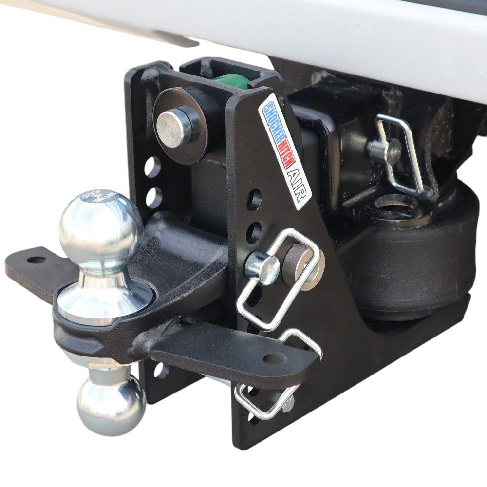 Experience the smoothest and straightest towing with the Shocker 14K Max Black Air Ride Receiver Hitch, featuring an adjustable sway control combo ball mount. Designed for bumper mounting, this robust air hitch can handle up to 14,000 lbs and is equipped with sway bar mount tabs attach friction sway control arm bars. The air ride hitch absorbs the road shock and jerking, plus naturally reduces sway helping your truck and trailer stay aligned on the road. If sway arm bar kits are added, that allows you to adjust them if trailer sway is an issues. Great for pickup trucks, vans, motorhomes, RV's and SUV’s with the receiver under the bumper. Absorbs the bumps, bangs, jerks, tugs and sways creating safer, smoother trailer towing.The Shocker 14k Max Black air hitch boasts an impact-resistant matte black powder-coated frame, ensuring it looks great for years to come. Most importantly, it provides immediate air ride towing for your pickup and trailer. This hitch includes a combo ball mount with sway bar tabs compatible with basic sway control arm bars and mini hitch balls. It features both a 2" and a 2-5/16" hitch ball, with sway bar mount tabs on each side for added convenience.Chrome powder coat for the combo sway tab ball mount, designed specifically for heavy-duty trailer towing. It offers eight adjustment holes for drops ranging from 1/2" to 4-1/2" and has a towing capacity of 14,000 lbs with a 1,400 lbs tongue weight. The Shocker Hitch Heavy-Duty Max Black air bumper hitch ensures an exceptional towing experience by incorporating an air suspension system that absorbs road shock, resulting in a smoother, safer ride.This shock-absorbing ball mount fits into a standard receiver hitch tube, effectively cushioning the bumps, jerks, and roughness of trailer towing. The combo multi-ball mount features welded hitch balls for enhanced strength and comes in a premium finish, helping to mitigate trailer sway. It's compatible with compact, midsize, and full-size pickup trucks, vans, and select SUVs with a receiver hitch under the bumper.Manufactured by Shocker Hitch® USA in Jamestown, ND, the air ride system sits beneath the receiver tube, providing a compact distance of 10 inches between the mounting pin and ball center. The adjustable air pressure feature of the Air Shocker allows you to customize your ride and load control. Fits standard 2-1/2" receiver tube.