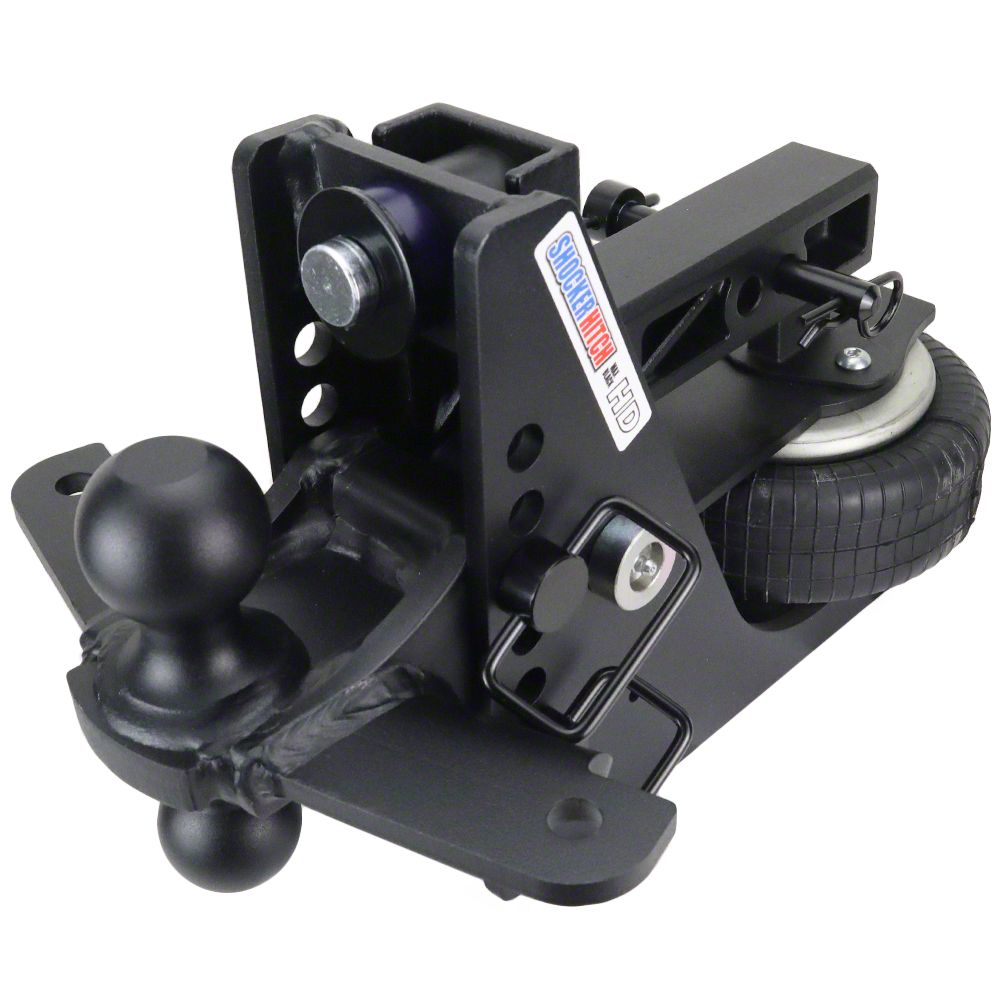 Get the smoothest, straightest towing experience when using the Shocker HD Max Black Air hitch with a sway control combo ball mount. If you do heavy-duty towing and trailer sway is a problem for you, here is the solution. This bumper-mounted combo ball 20,000 lbs air hitch with sway bar control tabs was designed specifically to remove any road shock or jerking, as well as keep your truck and trailer pulling straight down the road. The Shocker HD Max Black air hitch has an impact-resistant, durable matte black powder-coat frame for years of great looks. But most importantly, this HD air hitch adds instant air ride towing to your pickup and trailer. This Shocker HD Air Hitch has a combo ball mount with sway bar tabs made for the basic sway control arm bars with a mini hitch ball. The combo ball mount has both a 2″ hitch ball and a 2-5/16″ hitch ball, along with sway bar mount tabs on both sides for basic sway control mini hitch balls. You can choose chrome, red, or black powder coat for the combo sway tab ball mount. It’s made for heavy-duty trailer towing. It also offers 8 adjustment holes for 1/2″ to 4-1/2″ drop. 20,000 lbs tow rating capacity and 2,000 lbs tongue weight. Shocker Hitch Heavy-Duty Max Black air bumper hitch provides the ultimate smooth towing experience. This shocker absorbing hitch is an air suspension towing hitch mounted between your pickup truck and trailer. The built-in 20k HD air ride system cushions the ride and absorbs the road shock, creating a smoother and safer towing experience. This Shocker air receiver hitch with a sway bar ball mount fits into a standard receiver hitch tube. This shock-absorbing ball mount takes the bumps, jerks, tugs, and roughness out of trailer towing and cushions your ride. The combo multi-ball mount comes in a premium finish. Cushions your ride and works nicely to help the tendency of trailer sway. Works great on compact, midsize, and full-size pickup trucks, vans, and select SUVs with the receiver hitch under the bumper. Have a CUV? Check out our Cushion Hitches. Manufactured by Shocker Hitch® USA in Jamestown, ND.