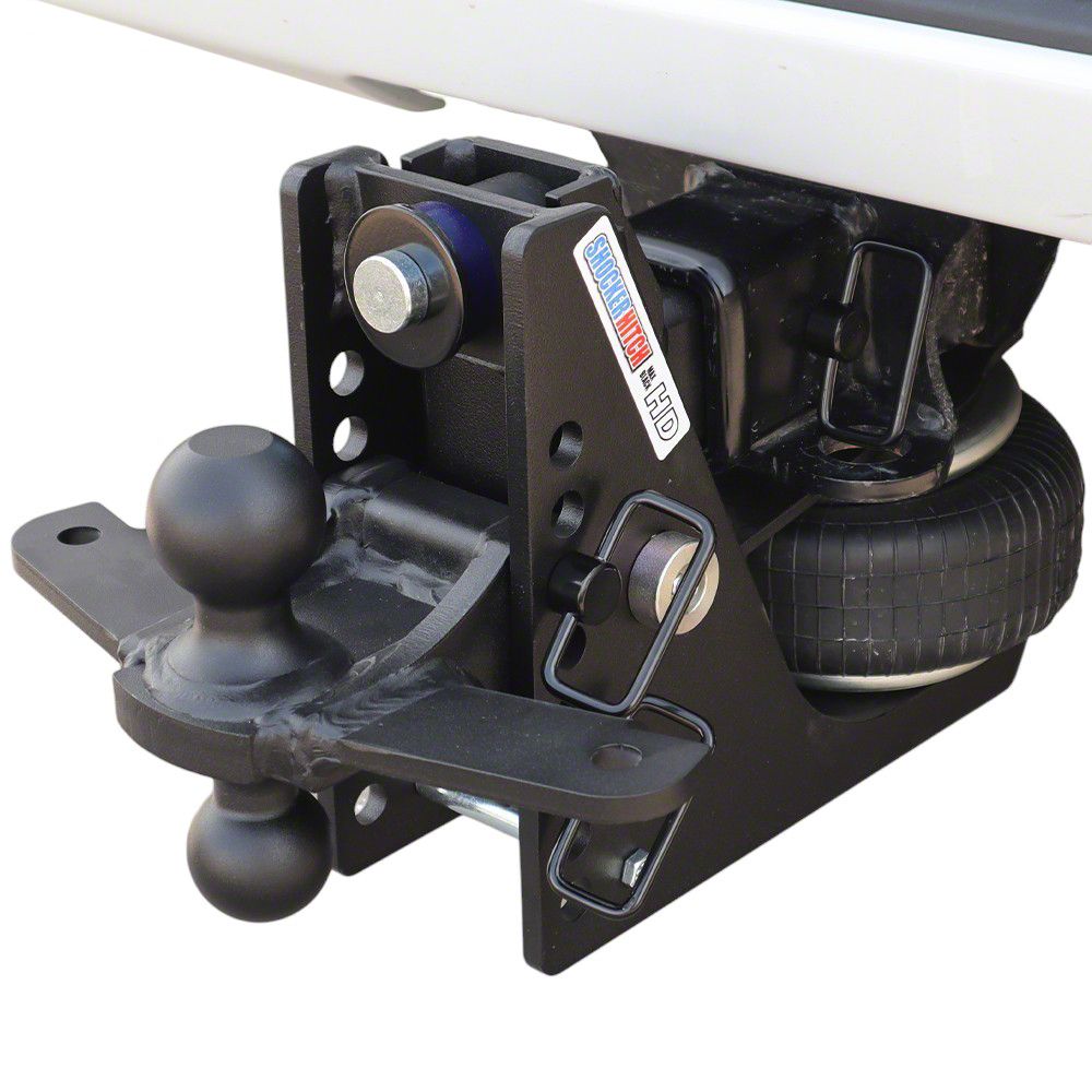 Get the smoothest, straightest towing experience when using the Shocker HD Max Black Air hitch with a sway control combo ball mount. If you do heavy-duty towing and trailer sway is a problem for you, here is the solution. This bumper-mounted combo ball 20,000 lbs air hitch with sway bar control tabs was designed specifically to remove any road shock or jerking, as well as keep your truck and trailer pulling straight down the road. The Shocker HD Max Black air hitch has an impact-resistant, durable matte black powder-coat frame for years of great looks. But most importantly this HD air hitch adds instant air ride towing to your pickup and trailer. This Shocker HD Air Hitch has a combo ball mount with sway bar tabs made for the basic sway control arm bars with a mini hitch ball. The combo ball mount has both a 2" hitch ball and a 2-5/16" hitch ball, along with sway bar mount tabs on both sides for basic sway control mini hitch balls. Premium black powder-coat base with Black balls for the combo sway tab ball mount. It's made for heavy-duty trailer towing. It also offers 8 adjustment holes for 1/2" to 4-1/2" drop. 20,000 lbs tow rating capacity and 2,000 lbs tongue weight. Shocker Hitch Heavy-Duty Max Black air bumper hitch provides the ultimate smooth towing experience. This shocker absorbing hitch is an air suspension towing hitch mounted between your pickup truck and trailer. The built-in 20k HD air ride system cushions the ride and absorbs the road shock, creating a smoother and safer towing experience. This Shocker air receiver hitch with a sway bar ball mount fits into a standard receiver hitch tube. This shock-absorbing ball mount takes the bumps, jerks, tugs, and roughness out of trailer towing and cushions your ride. The combo multi-ball mount comes in a premium finish. Cushions ride and works nicely to help the tendency of trailer sway. Works great on compact, midsize, and full-size pickup trucks, vans, and select SUVs with the receiver hitch under the bumper. Have a CUV? Check out our Cushion Hitches. Manufactured by Shocker Hitch® USA in Jamestown, ND.The air ride system sits under the receiver tube, allowing a short distance of 10-inches between the mounting pin and ball center. You will find the advantage of the Air Shocker is your ability to adjust air pressure for the best ride and load control. Fits standard 2-1/2" receiver tube.Sway Bar combo ball mounts with sway control bar tabs are welded for superior strength. The sway control tab mount is designed to work with the Shocker 1001 Friction Sway control kit, which is not included and is available separately. Suggested to get 1 kit if towing under 10,000 lbs and 2 kits if towing over 10,000 lbs.