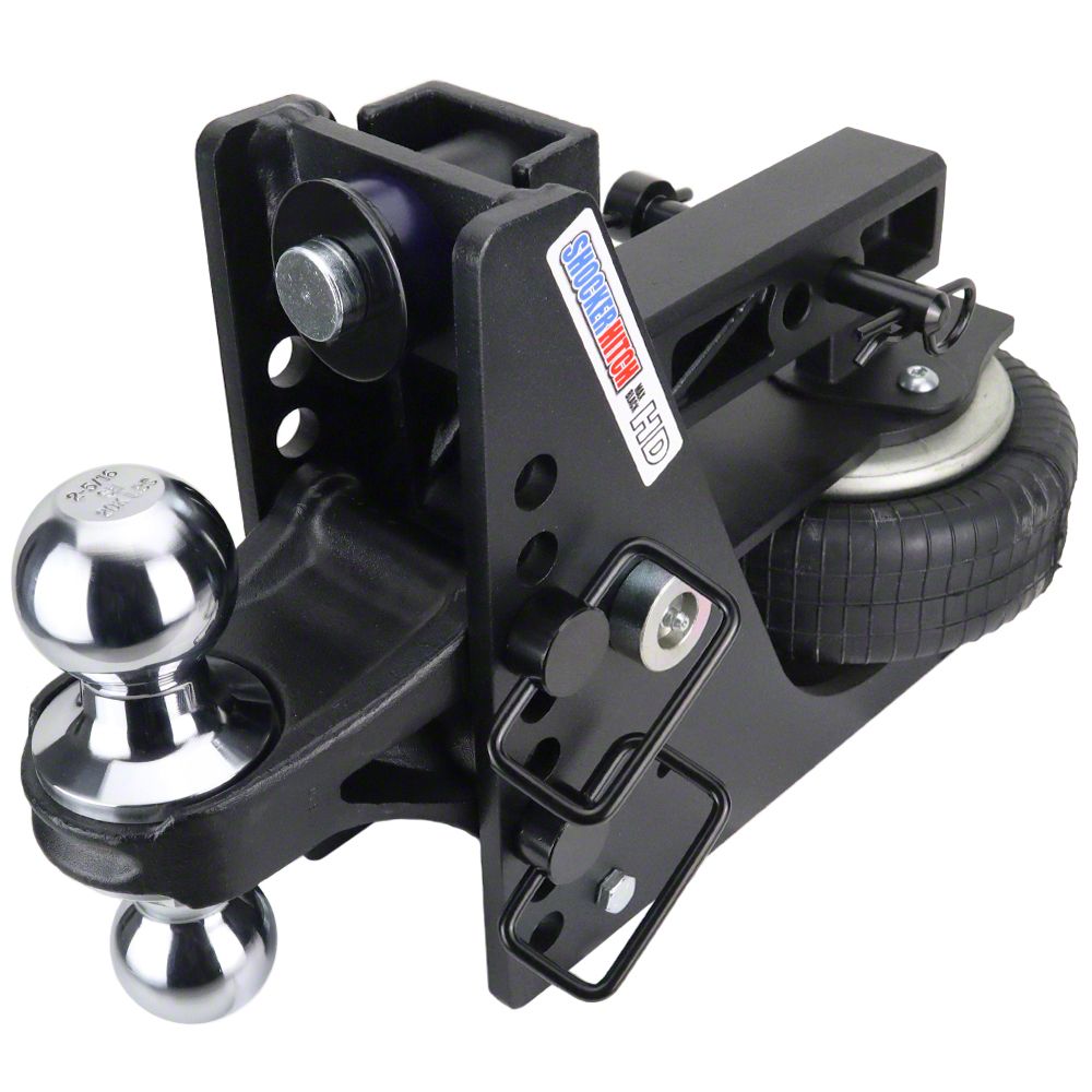 The Shocker HD Max Black™ Air Receiver Hitch with combo multi-ball mount adds instant air ride your your tow vehicle and trailer and comes with the all-new matte black premium powder-coat finish. This Max Black bumper mount air hitch from Shocker Hitch has both a 2" hitch ball and a 2-5/16" hitch ball with a 1/2" to 4-1/2" Drop. Instantly add air ride towing for your pickup and trailer. This 20K heavy-duty shock absorbing hitch & ball mount cushions the ride and takes the bumps and bangs out of towing. Shocker heavy-duty bumper-style air hitch provides the ultimate smooth ride when you're towing and allows you to fine-tune your trailer towing experience base on the weight you are pulling. The Shocker Air is a heavy-duty air suspension towing hitch mounted between your truck and trailer. The built in heavy-duty air ride receiver system absorbs the road shock, bumps, bangs, jerks, tugs and sways, reducing the tendency of trailer sway and cushions your ride. The built in dual bump cushions also taken bangs and bumps of the road for additional extra duty performance. The heavy duty Shocker air ride hitch effectively absorbs the jerking, tugging and damaging forces experienced with a typical hard connection when towing trailers. There is no reason to beat yourself or your equipment up with a hard connection between your trailer and your receiver hitch. Upgrade to smooth, safer towing. This 2” air hitch cushions the ride for you, your trailer and the trailer contents. Great for all around heavy-duty bumper hitch towing. 20,000 lbs tow rating capacity and 2,000 lbs tongue weight. The combo ball mount features combo balls for versatility and comes in a matte black powder coat finish base frame and chrome Balls. Save money too by reducing wear and tear on driveline and frame! Treat yourself, your equipment, and your passengers to a much smoother ride. You’ll never go back to the ‘old days’ of continual bumps, jerks, and vibrations. Join the list of satisfied customers that are using Shocker HD max black air bumper hitches. Get ready for your ultimate smooth towing experience the next time out. This Shock absorbing air ride cushion hitch mounts by sliding into a standard receiver tube. Made for pickup trucks. Also works with vans and select SUVs with the receiver tube underneath the bumper. The 20K air ride trailer towing system sits under the receiver tube allowing a short distance of 10-inches between mounting pin and ball center. You will find the advantage of the Air Shocker is your ability to adjust air pressure for best ride and load control. The Shocker HD is 20,000 lbs towing capacity and 2,000 lbs on tongue weight. Quality Manufacturing: Made by Shocker Hitch® USA in Jamestown, ND.
