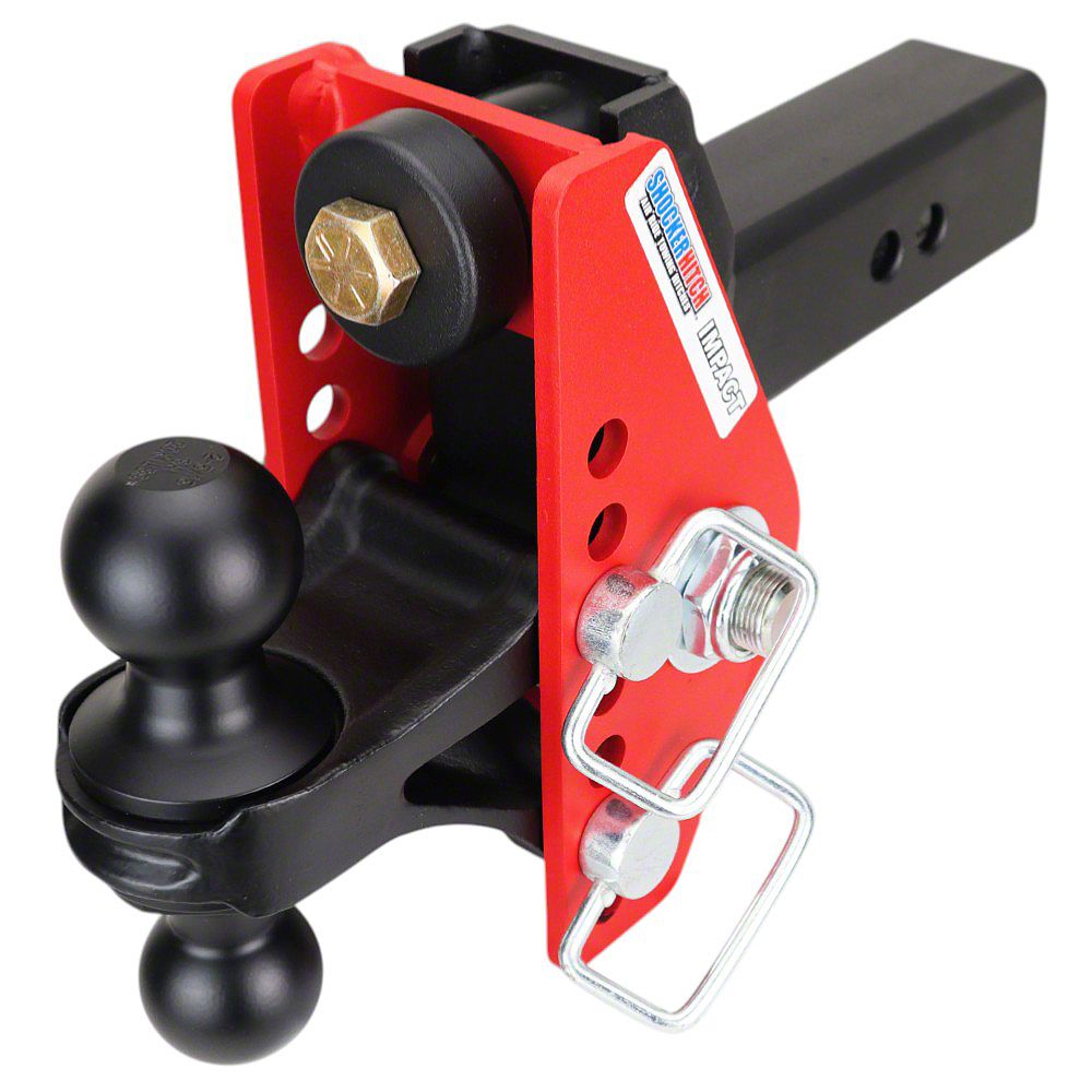 The Shocker Impact cushion hitch with adjustable Black combo ball mount is designed for heavy duty to cushion the towing experience and create a smooth ride. Great for contractors, boat owners, enclosed trailers, campers, car trailers and even motorhomes. The pivoting, shock absorbing dual bump cushioning design is heavy duty and can handle the rough roads and give you a smooth tow. The bumps and bangs and filtered through the double cushions and the unique flip around design, allows you to flip the entire hitch around for more drop or rise. The adjustable Black combo multi-ball mount has both a 2" hitch ball and a 2-5/16" hitch ball. This shocker absorbing combo hitch gives you 4" of rise to 4" of drop. Combo ball mount offers versatility for towing trailers with 2" or 2-5/16" ball couplers and features a safety red impact resistant textured durable powder coat finish. Shocker Impact cushioned hitch ball mount provides the ultimate in versatility and a smoother towing experience than a solid ball mount. The Impact ball mount has built in adjustability maximum versatility with 7 adjustment holes for your towing needs. Works great on motorhomes, rv's, pickup trucks, full size vans, suvs, cuvs and minivans. 2 hitch pin holes to adjust the length and there is plenty of room on the receiver shank to accommodate hitch mounted towing mud flaps or shocker bumper tow flaps. Use this adjustable ball mount however you need to for tons of versatility. This Shocker Impact cushioned combo ball mount attaches by sliding into a standard receiver tube. 14,000 lbs tow rating capacity and 1,400 lbs tongue weight. Fits 2-1/2" reciever hitch Shank.