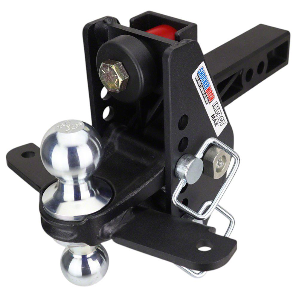 The Shocker Impact Max Black cushioned hitch ball mount with sway bar tabs is designed to cushion the towing experience and handle the road shock. Use this trailer towing hitch with friction sway bars. This shock absorbing cushion hitch ball mount is often considered the ideal boat towing and camper trailer towing hitch. The 20k dual heavy-duty bump cushion design is rated up to 20,000 lbs. Featuring a combo multi-ball mount with both a 2" hitch ball and a 2-5/16" hitch ball with 7 adjustment holes for 8" of adjustment, giving you 4" of rise to 4" of drop. Shocker Impact Max cushioned hitch ball mount with sway bar tabs provides the ultimate in versatility and a smoother towing experience than a solid ball mount. Ideal for absorbing the road shock when you are towing up to 20,000 lb trailers; boat, skid steer, dump, cargo, snowmobile, fishhouse, campers and more. The Impact Max cushion style ball mount has built in adjustment for maximum versatility with 7 adjustment holes for your towing needs. This Shocker Impact Max cushioned combo ball mount attaches by sliding into a standard receiver tube. Use this adjustable cushioned ball mount however you need to for tons of versatility.  The Impact Max comes with impact resistant super durable textured matte black powder coated finish on the base frame for long-lasting life and a sleek finish. If you are looking for a Shocker Hitch for an SUV, this is it. Works great on pickup trucks, vans, SUVs, CUVs, minivans & motorhomes. Up to 20,000 lbs tow rating capacity and 2,000 lbs tongue weight. Dual combo ball has a premium Chrome finish. The shank fits a standard 2" reciever hitch. Since it has 2 hitch pin holes, it also works with hitch mounted towing mud flaps. Made by Shocker Hitch® USANote: The sway control tab mount is designed to work with the Shocker Friction Sway control kit or similar sway kit,  which are not included and are available separately. Suggested to get 1 kit if towing under 10,000 lbs and 2 kits if towing over 10,000 lbs.