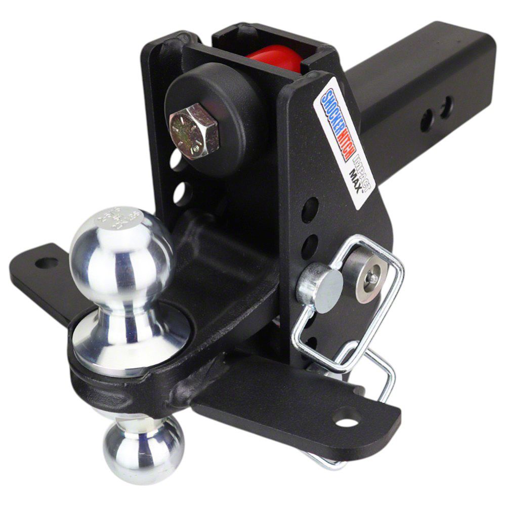 The Shocker Impact Max Black cushioned hitch ball mount with sway bar tabs is designed to cushion the towing experience and handle the road shock. Use this trailer towing hitch with friction sway bars. This shock absorbing cushion hitch ball mount is often considered the ideal boat towing and camper trailer towing hitch. The 20k dual heavy-duty bump cushion design is rated up to 20,000 lbs. Featuring a combo multi-ball mount with both a 2" hitch ball and a 2-5/16" hitch ball with 7 adjustment holes for 8" of adjustment, giving you 4" of rise to 4" of drop. Shocker Impact Max cushioned hitch ball mount with sway bar tabs provides the ultimate in versatility and a smoother towing experience than a solid ball mount. Ideal for absorbing the road shock when you are towing up to 20,000 lb trailers; boat, skid steer, dump, cargo, snowmobile, fishhouse, campers and more. The Impact Max cushion style ball mount has built in adjustment for maximum versatility with 7 adjustment holes for your towing needs. This Shocker Impact Max cushioned combo ball mount attaches by sliding into a standard receiver tube. Use this adjustable cushioned ball mount however you need to for tons of versatility.  The Impact Max comes with impact resistant super durable textured matte black powder coated finish on the base frame for long-lasting life and a sleek finish. If you are looking for a Shocker Hitch for an SUV, this is it. Works great on pickup trucks, vans, SUVs, CUVs, minivans & motorhomes. Up to 20,000 lbs tow rating capacity and 2,000 lbs tongue weight. Dual combo ball has a premium Chrome finish. The shank fits a standard 2-1/2" reciever hitch. Since it has 2 hitch pin holes, it also works with hitch mounted towing mud flaps. Made by Shocker Hitch® USANote: The sway control tab mount is designed to work with the Shocker Friction Sway control kit or similar sway kit,  which are not included and are available separately. Suggested to get 1 kit if towing under 10,000 lbs and 2 kits if towing over 10,000 lbs.