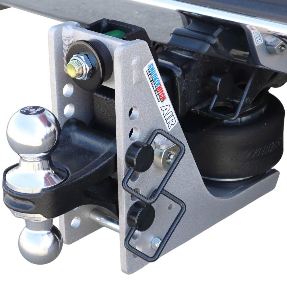 The revolution of towing has begun with the Shocker Streamline aluminum air hitch with the combo ball. This lightweight but strong rust free aluminum hitch with Chrome dual combo ball that has a 2" hitch ball and 2-5/16" ball can pull up to 10,000 lbs. Get air ride trailer towing in minutes. The aluminum hitch frame, 2" receiver shank, and paddle offer a rust-free design for years and years for great looks on your pickup or SUV. The Shocker Aluminum Air Hitch base frame includes everything including d-handle black ball mount attachment pins and chrome combo ball. Featuring 8 adjustment holes and is great for a variety of trailer towing applications such as towing boats, smaller campers, utility trailers, snowmobile trailers, fish or ice house, jet skis, car trailers and more.The aluminum air hitch has a 10,000 lbs tow rating capacity and a 1,000 lbs tongue weight. The aluminum Shocker Air provides the ultimate smooth ride. This shock-absorbing hitch with air ride bag is the best cushioning device on the planet. The Shocker Air is a miniature air suspension unit mounted between your truck and trailer. This Shocker mounts by sliding into a standard receiver tube. Fits Pickup Trucks, Vans, and Select SUV's with the receiver hitch tube mounted underneath the bumper. Manufactured by Shocker Hitch® USA in Jamestown, ND.The air spring bag sits under the receiver tube allowing a short distance of 10 inches between the mounting pin and ball center. You will find the advantage of the Air Shocker is your ability to adjust air pressure for the best ride and load control. Great for pickup trucks, vans, SUV's with Receiver Under Bumper, RV & Motorhome.