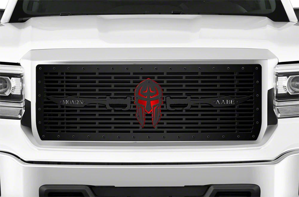 Application. The 1-Piece Steel Upper Grille Insert; Molon Labe with Red Acrylic and Stainless Steel Underlay fits 2014-2015 Sierra 1500 models.