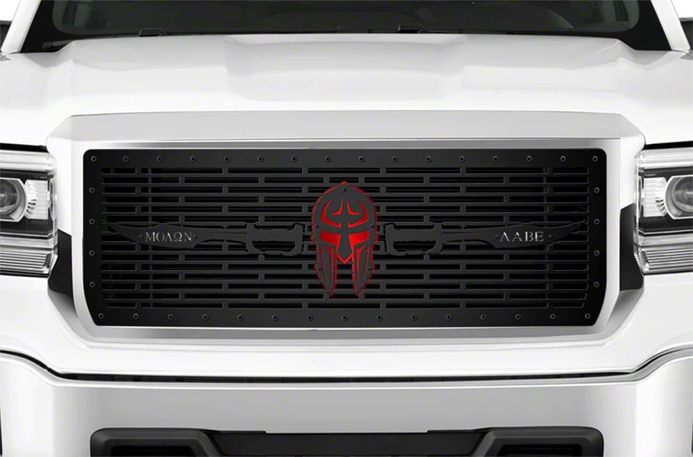 Bold Styling. Elevate the look of your Sierra, and complement its rugged design with this 1-Piece Steel Upper Grille Insert; Molon Labe with Red Acrylic and Stainless Steel Underlay. The combination of vibrant red acrylic and sleek stainless steel underlay provides an impressive contrast to the black steel grille, creating a visually striking effect that will set your truck apart from the rest.