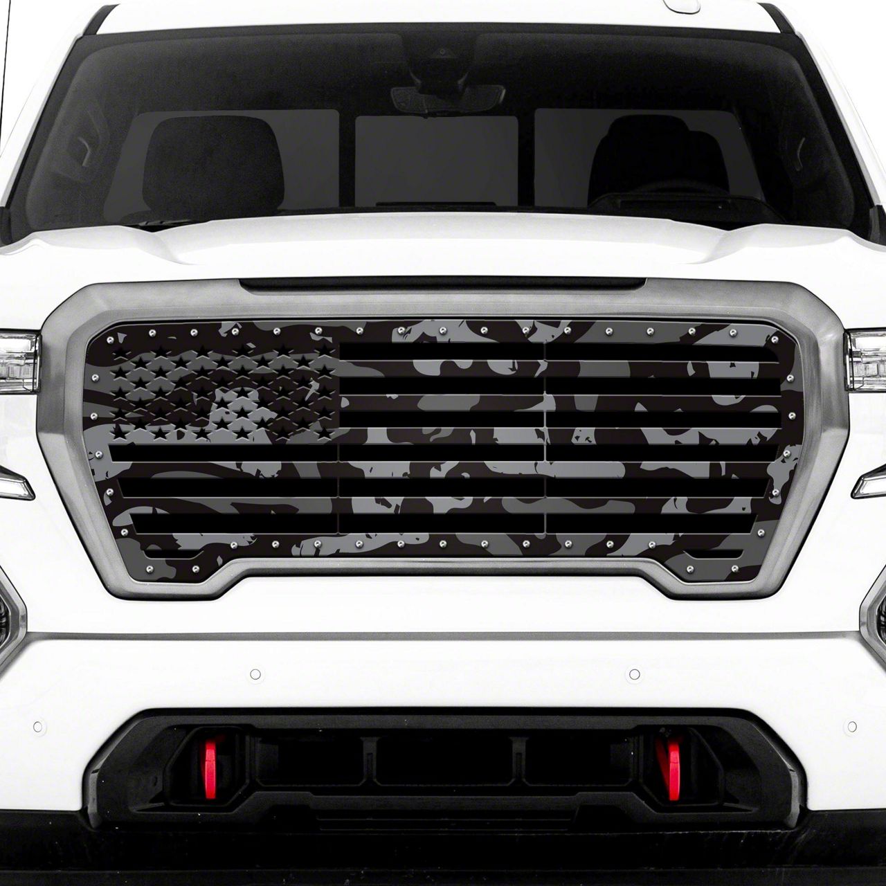 1-Piece Steel Upper Grille Insert; Printed Subdued Camo Straight American Flag (19-21 Sierra 1500; 2022 Sierra 1500 Limited)Find parts that fit my vehicle