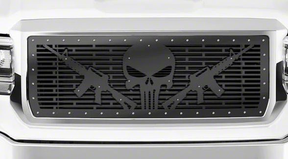 Striking Details. Elevate your truck's front-end appearance with the Punisher AR-15 design, meticulously crafted from 16-gauge stainless steel for unbeatable durability. This 1-Piece Steel Upper Grille Insert is overlaid with a sleek satin black powder coating, ensuring a long-lasting and corrosion-resistant finish.