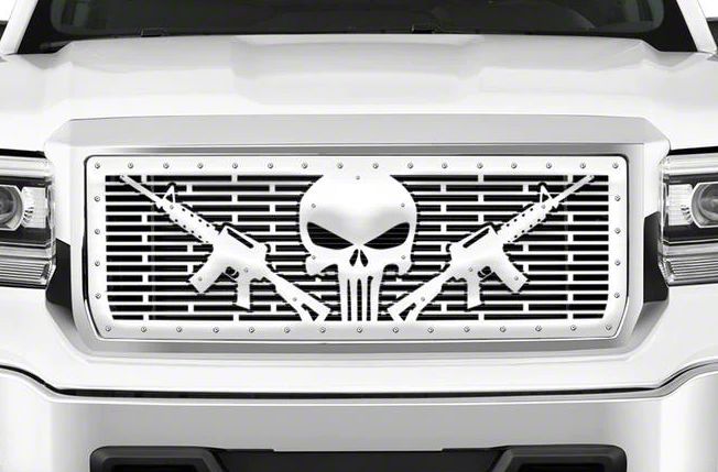 Distinctive Vehicle Enhancement. The Upper Grille Insert offers a unique blend of style and toughness with its Punisher AR-15 design, tailored for 2014-2015 Sierra 1500 models. This insert is crafted from 16G stainless steel, featuring a polished silver finish that provides both aesthetics and durability. The precision laser cut ensures a perfect fit, while installation requires modification to the stock grille, offering a customized and aggressive look to the vehicle.