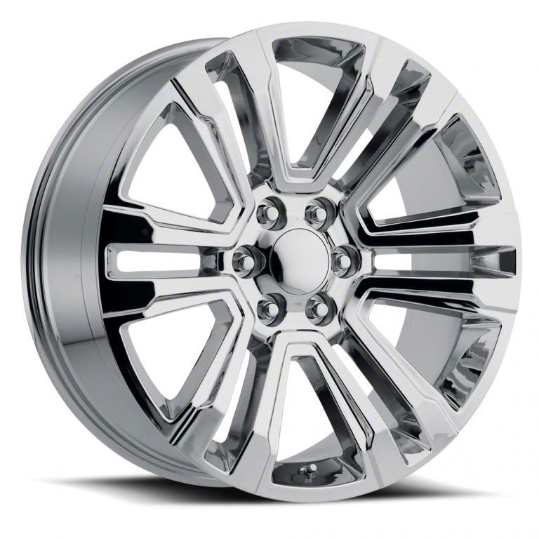 This 22x9 2017 Denali Replica Chrome 6-Lug Wheel is completed in a high-quality polished chrome finish that was achieved in a 3-step process involving copper, nickel and chrome. There's a durable clear coat that protects against driving hazards.