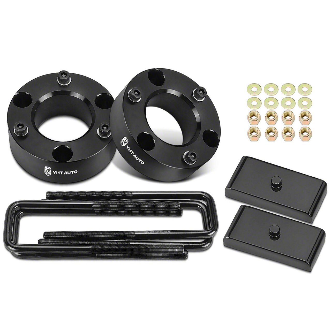 Construction and Appearance. Finished in a sleek glossy black, this kit combines the strength of steel and aluminum to ensure long-lasting durability. The components, including lift blocks, U-bolts, and spacers, are crafted to withstand tough road conditions, providing a secure lift that maintains factory quality.