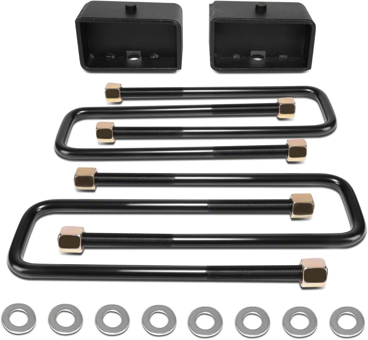 Item Includes : Comes with a Pair of Leaf Spring Mount Rear Leveling Kit Lift Blocks and Set of Longer Length Steel U-Bolts, Mounting Hardware Provided. Easy Bolt In Installation