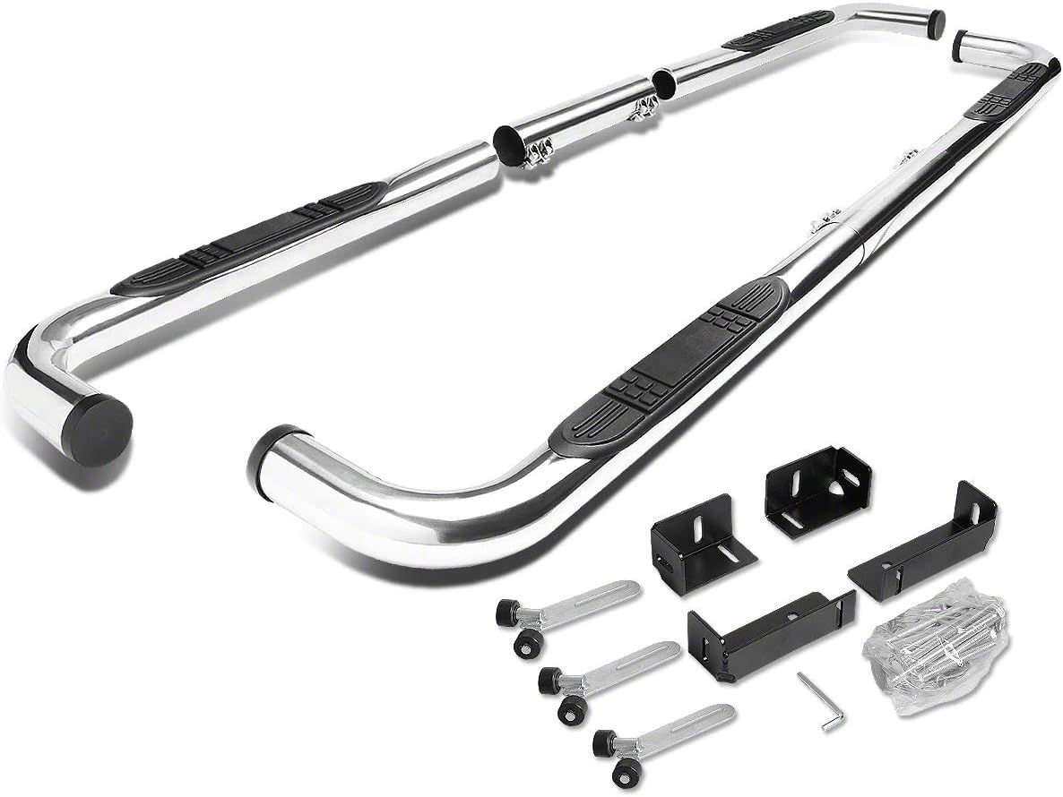 Construction and Appearance. Crafted from high-quality stainless steel, these nerf bars are corrosion-resistant and built to last. The three-inch round tubing delivers a balanced design of durability and visual appeal. Large molded step pads offer slip resistance, ensuring safety for both driver and passengers. With a polished finish, these steps add a stylish accent to your truck's exterior.