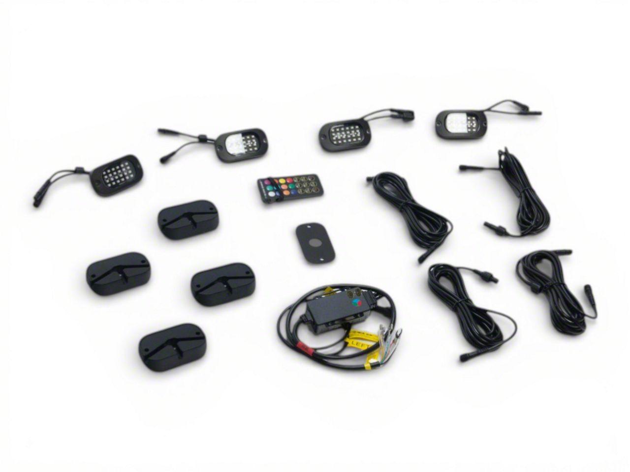 Description. Quickly and easily add brilliant accent lighting to any vehicle with this RGB Wide Angle Rock Light Kit. This kit includes four rock lights along with a Heise Connect RGB Controller and mounting bases. Each light has an improved output angle over traditional rock lights, are daisy-chainable, and are controlled via the Heise Connect mobile app featuring 24 pre-programmed RGB patterns.
