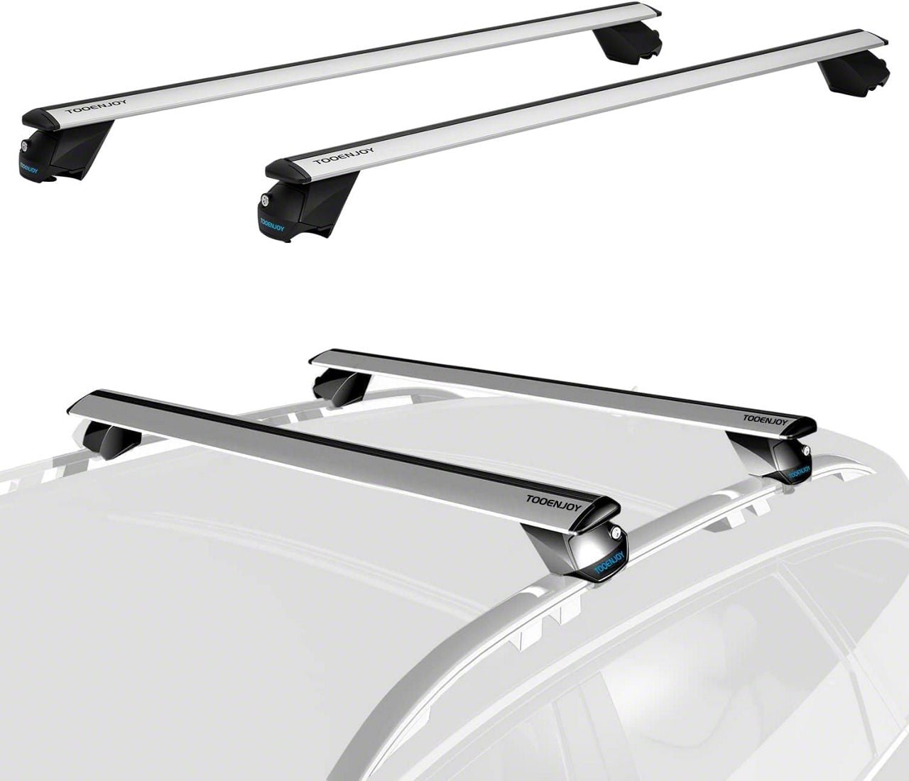 Tooenjoy roof rack crossbars are adjustable from 30 inches to 44 inches of rail spacing. Compatible with cars and SUVs with raised side rails. Featured 4pcs premium locking set for anti-theft. Powder-coat finished aluminum, providing scratch resistance and anti-corrosion allowing for years of use. Clamp stand bases with rubber pads secure crossbars firmly on the vehicle side rails and protect the vehicle from scratching. Sturdy enough to carry loads up to 198lbs. Free up inner space of your vehicle and maximize the storage possibility to load camping gear, luggage, fishing poles, bikes, snowboards, skis, and other rooftop accessories.