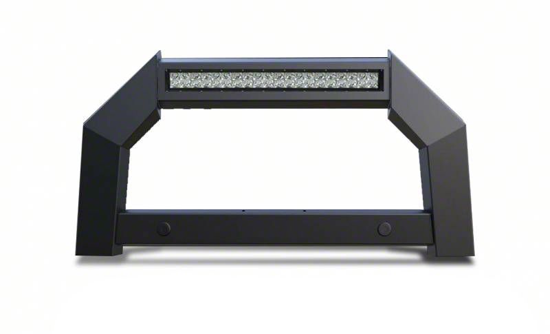 High-Strength Steel. The Armour Bull Bar with 20-Inch LED Light Bar is designed to provide additional protection for your truck's front end, while also adding a stylish and aggressive look. The bull bar is constructed from high-strength steel and finished with a durable matte black powder coat, providing maximum protection against rust and corrosion. The bar also features a rugged skid plate to protect your truck's undercarriage from damage while off-roading.
