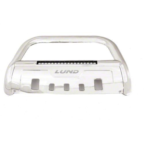 Construction and Appearance. Crafted from robust 3.5-inch 304 stainless steel tubing and plating, the bull bar offers exceptional durability and corrosion resistance. Its polished surface adds a rugged, yet refined touch to your truck, while the integrated light bar and skid plate blend seamlessly into the design for a professional-grade finish.