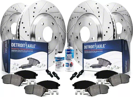 Premium-Quality Kit Components. The kit includes high-quality drilled and slotted 8-lug brake rotors, offering superior stopping power and enhanced cooling, resulting in reduced brake fade and increased durability. Alongside the rotors, you'll find ceramic brake pads that deliver excellent stopping performance, low dust, and reduced noise. To ensure optimal functionality, the kit also includes