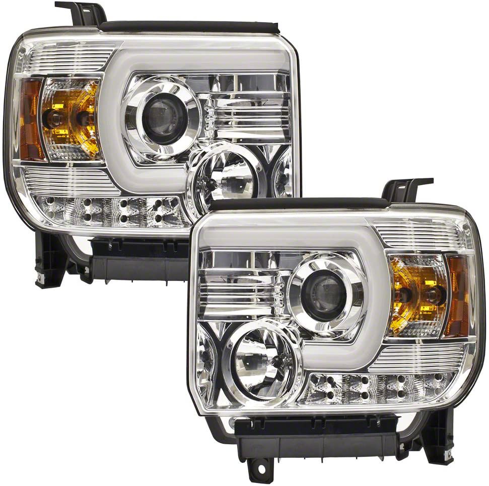 Quick Lighting Fix. For your Sierra's damaged lights with these DRL Projector Headlights; Chrome Housing; Clear Lens are a quick solution to get you back on the roads. It's expertly designed to provide street-safe brightness while also ensuring a reliable connection which doesn't fluctuate while in use. It also has LED daytime running lights to improve vision and aesthetics.