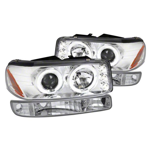 Dual Halo Lighting Upgrade. The Dual Halo Projector Headlights paired with Turn Signal Bumper Lights in chrome housing with clear lenses provide a comprehensive lighting upgrade that enhances visibility and adds modern style to your vehicle. These assemblies replace the factory units with high-performance lighting designed for optimal function and appearance.
