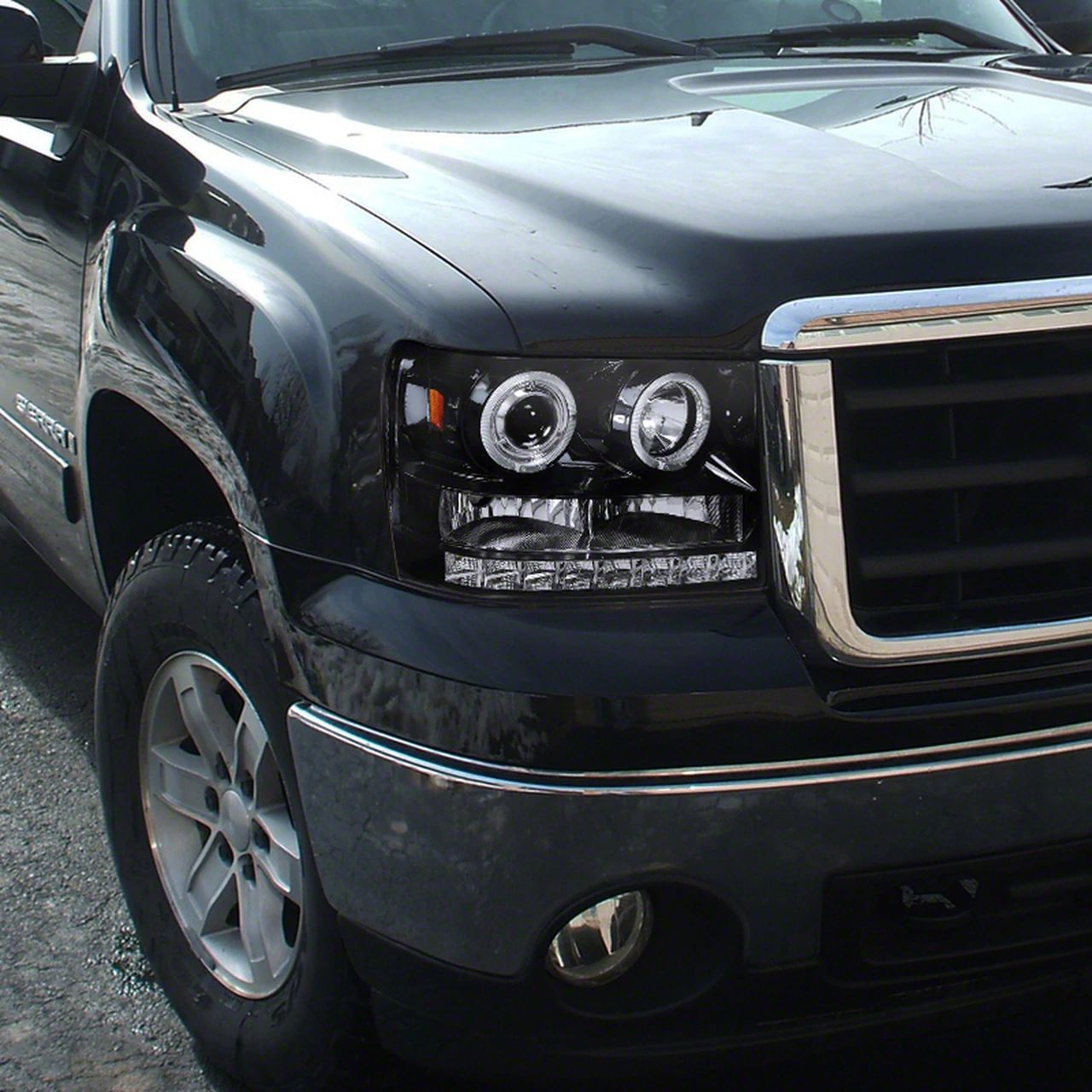 Application. These Dual Halo Projector Headlights; Black Smoked are designed to fit 2007-2013 GMC Sierra 1500 models. Driver and passenger side lights are included. High Beam H1, Low Beam H3.