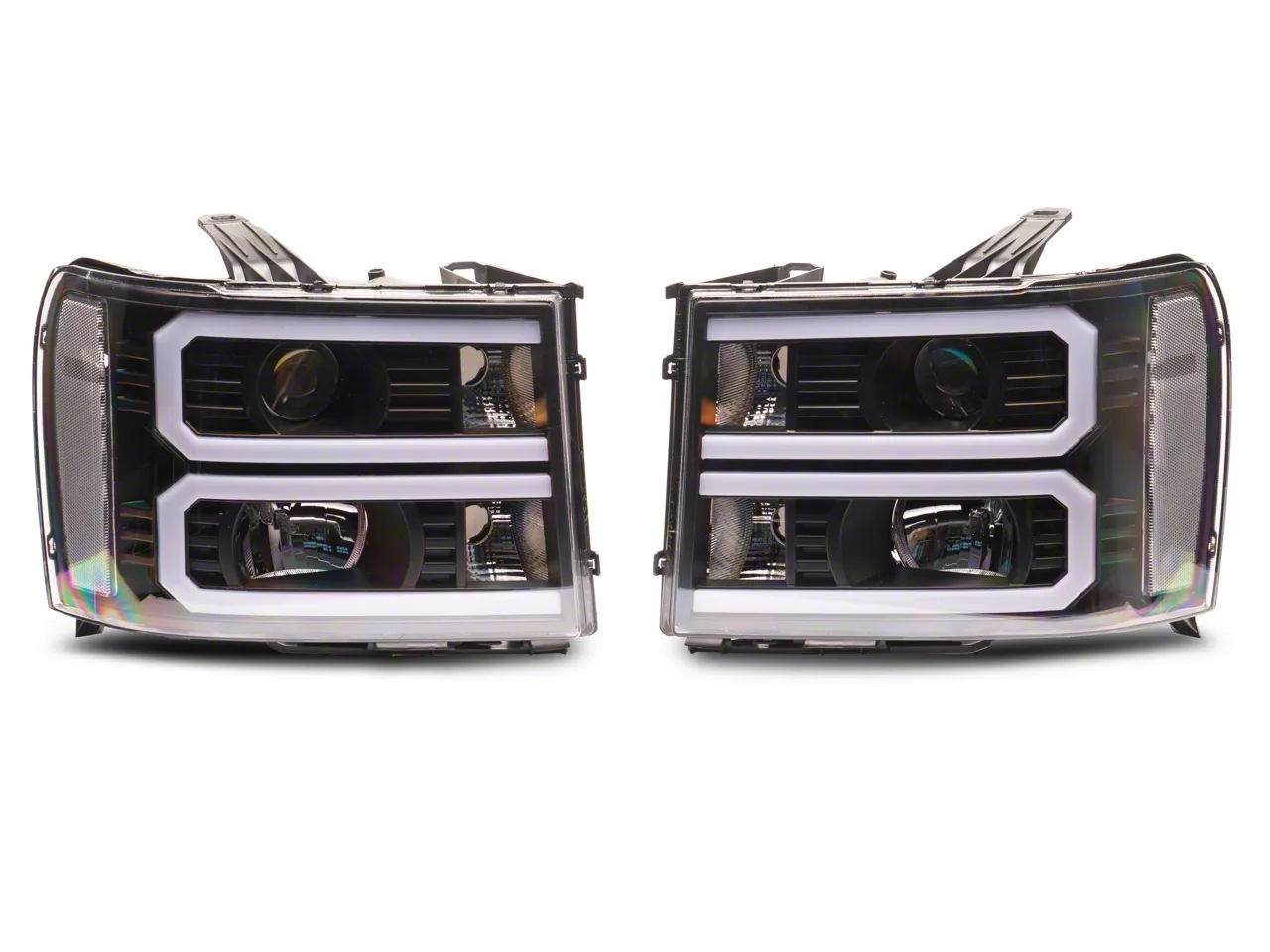 Modern Design Headlight Upgrade. Sometimes all it takes to is a headlight upgrade to overhaul your early-model Sierra’s style and functionality. Consider these Dual U-Bar LED DRL Headlights with Clear Corners; Black Housing; Clear Lens for your next mod. With a sleek modern design, these headlights will convince you that you don’t need a new truck. It features awesome U-halo DRL lights and projector low beams to improve your Sierra’s faccedilade and functionality.