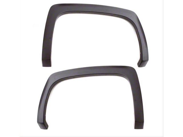 Construction and Appearance. These fender flares are constructed from high-quality materials to ensure durability and long-lasting performance. The textured black finish not only enhances the sporty look of your Sierra but also provides resistance to scratches and scuffs. Designed at stock width, they offer a seamless integration with your truck's existing body lines.