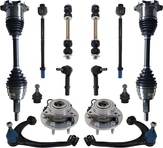 Construction and Features. Featuring a matte black and polished chrome finish, these components are both durable and visually appealing. Each part, including the CV axles, lower ball joints, hub assemblies, sway bar links, and tie rods, has undergone impact, wear, and fatigue testing to ensure long-lasting performance. The kit is OE compatible for a seamless integration with your vehicle’s factory setup.
