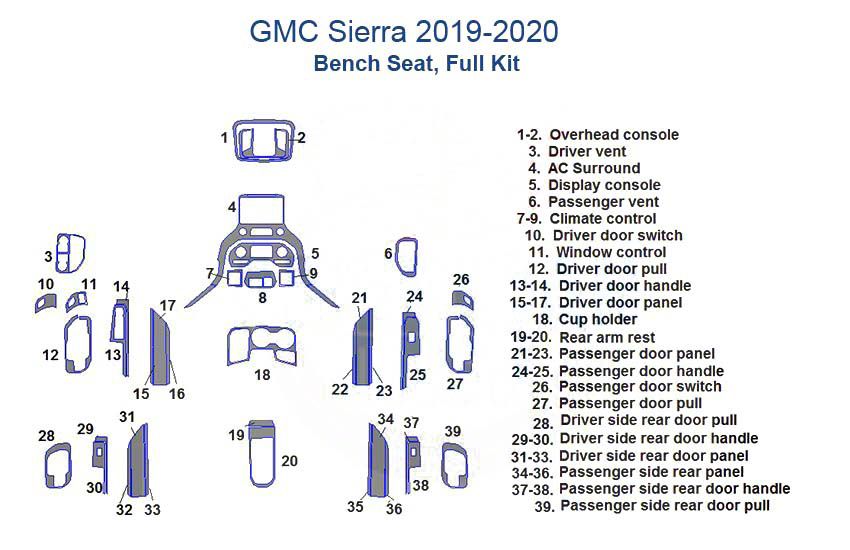 Application. This Full Dash Trim Kit fits all 2019-2020 GMC Sierra 1500 models with a Bench Seat.