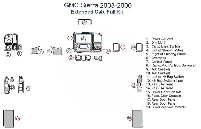 High quality dash trim kit in Zebra Rosewood finish. This is flat two-dimensional (not molded) dash trim kit. It is not a replacement of your existing dashboard. The parts are installed on top of the corresponding areas of vehicle dashboard. Compatible only with GMC Sierra-1500 2003 2004 2005 2006 Extended Cab.