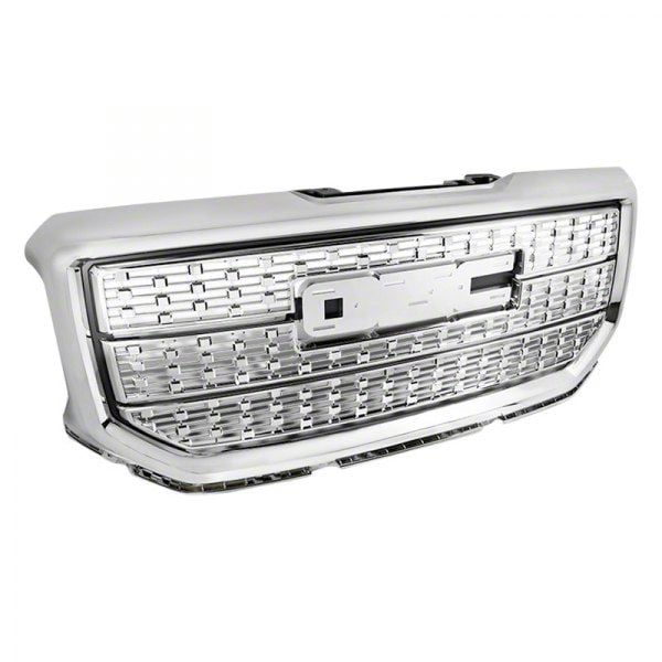 Bug and Scuff Protection. Add a sporty and sleek aesthetic to your Sierra with this Denali-Style Chrome Grille. This high-gloss grille overlay doesn't just add stylishness to your truck, it also deflects any projectiles and debris that could possibly damage or accidentally enter your grille slots.