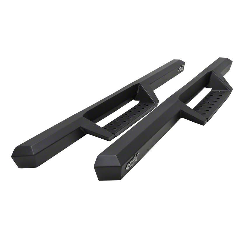 Black, Tough, and Durable. Manufactured from high-strength steel, these HDX Drop Nerf Side Step Bars are built to handle tough jobs. The hoop steps feature wear-resistant, die-stamped stainless steel plates with punched and raised holes to provide secure footings under any weather condition. Moreover, these step bars are covered in a textured black powder-coated finish for extra resistance against corrosion and other harsh outdoor elements.