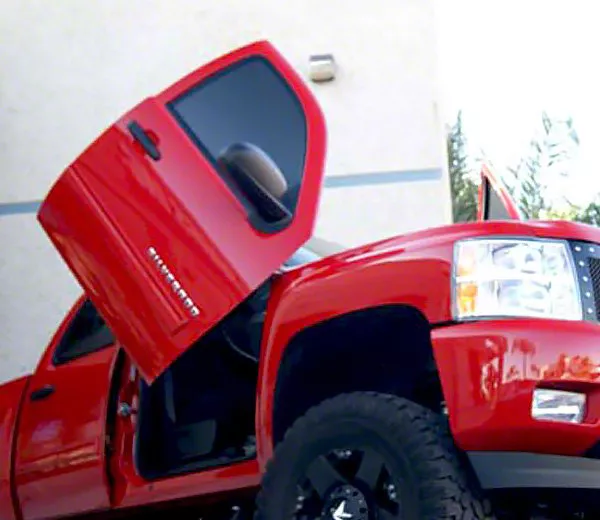 Spruce Up Your Doors. This Lambo Door Kit provides a great means to upgrade your Sierra's doors for a unique look. Once installed, your doors will open scissors-style - similar to a Lamborghini. It includes a powerful pair of shocks that can easily carry the doors’ weight for effortless opening and closing. For added convenience, it even utilizes your factory holes to avoid the need for any drilling.