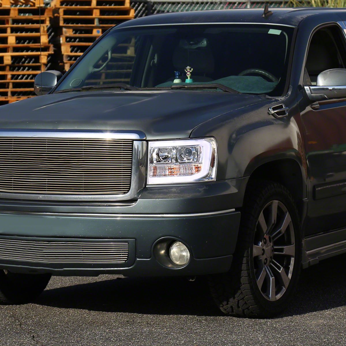 Application. These LED C-Bar Projector Headlights; Chrome Housing; Clear Lens are designed to fit 2007-2013 GMC Sierra 1500 models equipped with Halogen Headlights. Driver and passenger side lights are included.