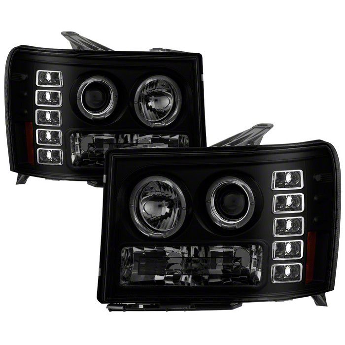 Application. These LED Halo Projector Headlights; Black Smoked are designed to fit 2007-2013 GMC Sierra 1500 models. Driver and passenger side lights are included. High Beam H1, Low Beam H1.