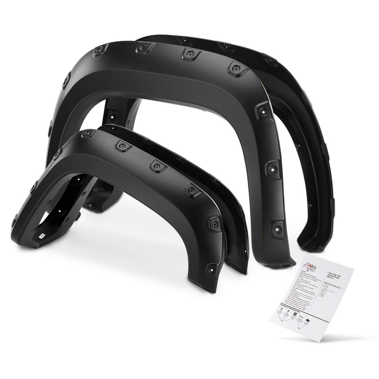 Premium Pocket Style Flares. The Pocket Style Fender Flares in Textured Black provide robust protection and a refined aesthetic upgrade for your truck's fenders. These fender flares shield the wheel wells from dirt, debris, and damage while enhancing the vehicle's rugged appearance. Designed to withstand various driving conditions, they help maintain the truck’s exterior integrity.
