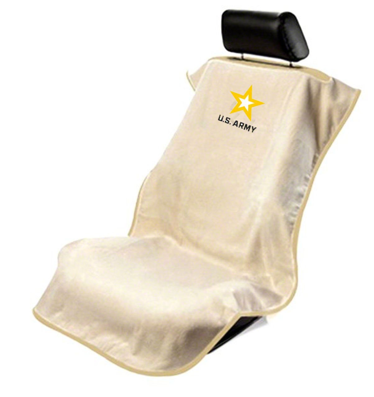 Added Seat Protection for You and Your Pet. As any pet owner, getting rid of pet hair can be a chore. Not so with this Seat Towel with Army Logo; Tan. This seat towel features a soft cotton terry cloth construction and will drape over your seats. This design allows this seat towel to prevent seat hairs from sticking to your seat cover. This same terry cloth construction makes this accessory a great choice when you need extra car seat protection against dirt, moisture, and sweat. Best of all, this towel includes a fully embroidered Dodge RAM logo, adding a bit of style to your interiors.