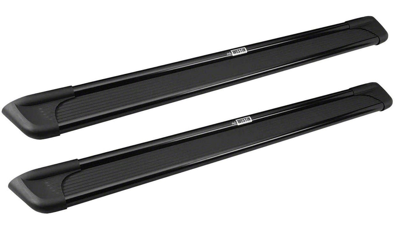 Construction and Appearance. Built from a durable extruded aluminum base board, these running boards ensure long-lasting performance and resilience. The black powder-coat finish not only enhances their visual appeal but also adds an extra layer of protection against the elements. The slip-resistant rubber step area provides superior grip, while the stylized molded end-caps complete the sleek, modern design.