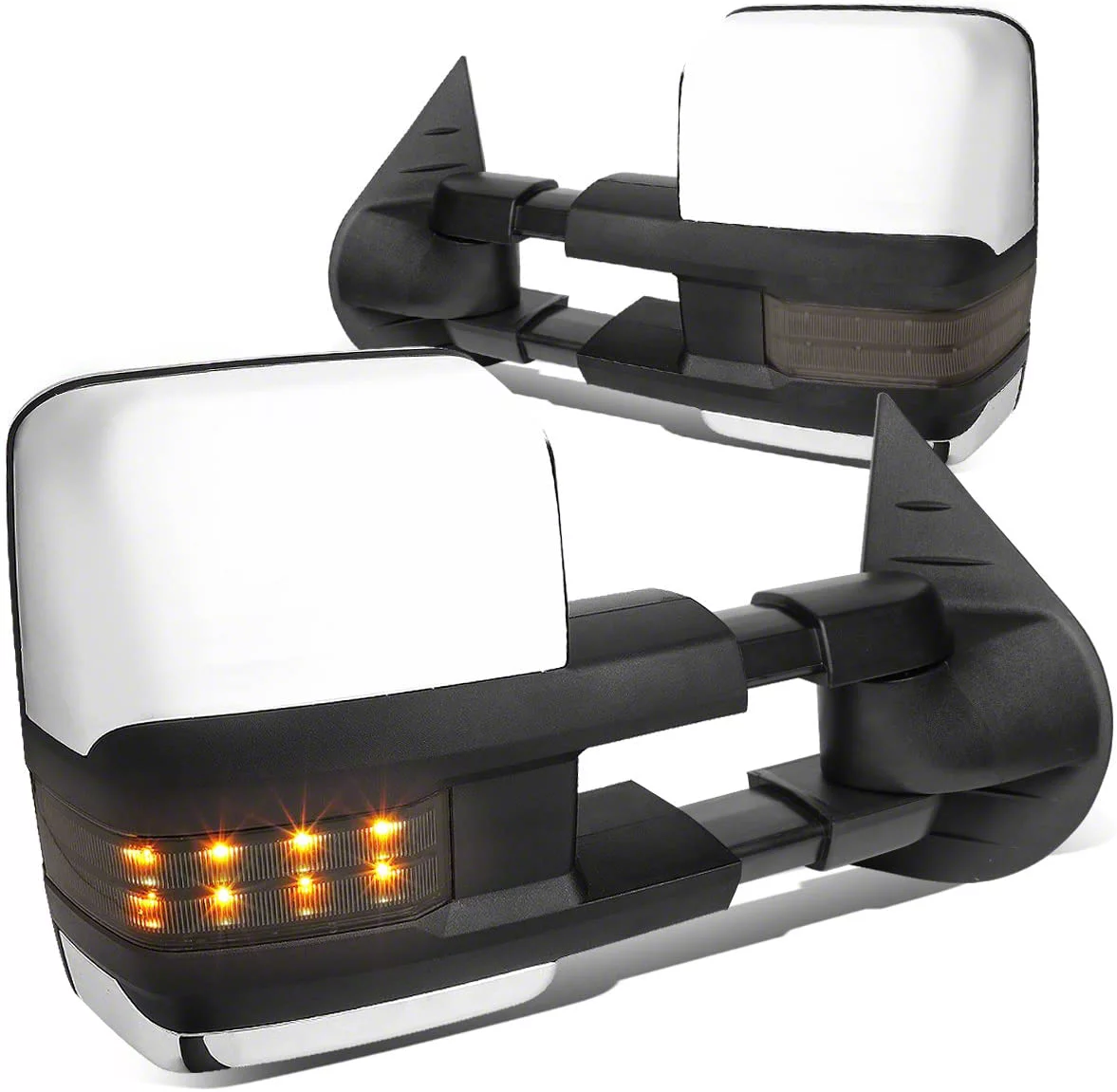 Stylish Towing Utility. Improve the appearance and functionality of your Sierra with these Powered Heated Towing Mirrors with Smoked Amber LED Turn Signal. It is equipped with a larger extendable shaft design and a telescoping system to accommodate the additional length of your trailer. It was created to provide a more ideal road side vision for vehicles that tow trailers. In addition, it has LED turn lights for increased visibility and safety when on dark highways with other motorists.