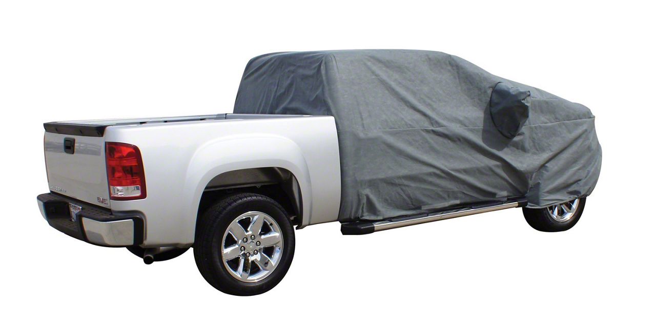 Provides Superior Protection. The gray Universal Easyfit Truck Cab Cover is made of breathable, non-woven polypropylene that repels water without trapping moisture. It has a soft and durable backing that pampers the paint finish while protecting it from UV rays, dirt, dust, moisture, and pollution.