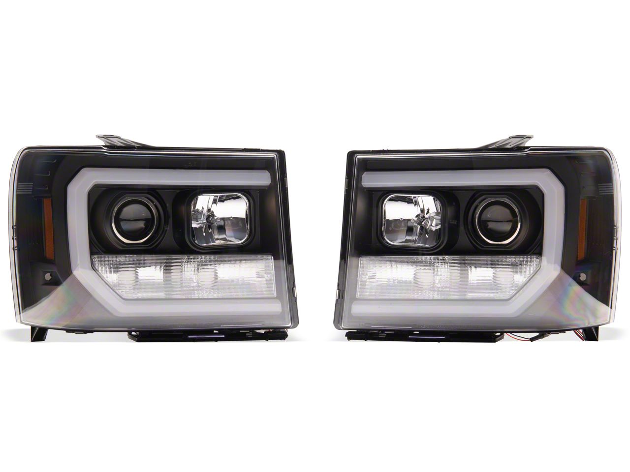 Application. These Version 2 Light Bar DRL Projector Headlights; Black are designed to fit 2007-2013 GMC Sierra 1500 models. Driver and passenger side lights are included. High Beam H1, Low Beam H1.