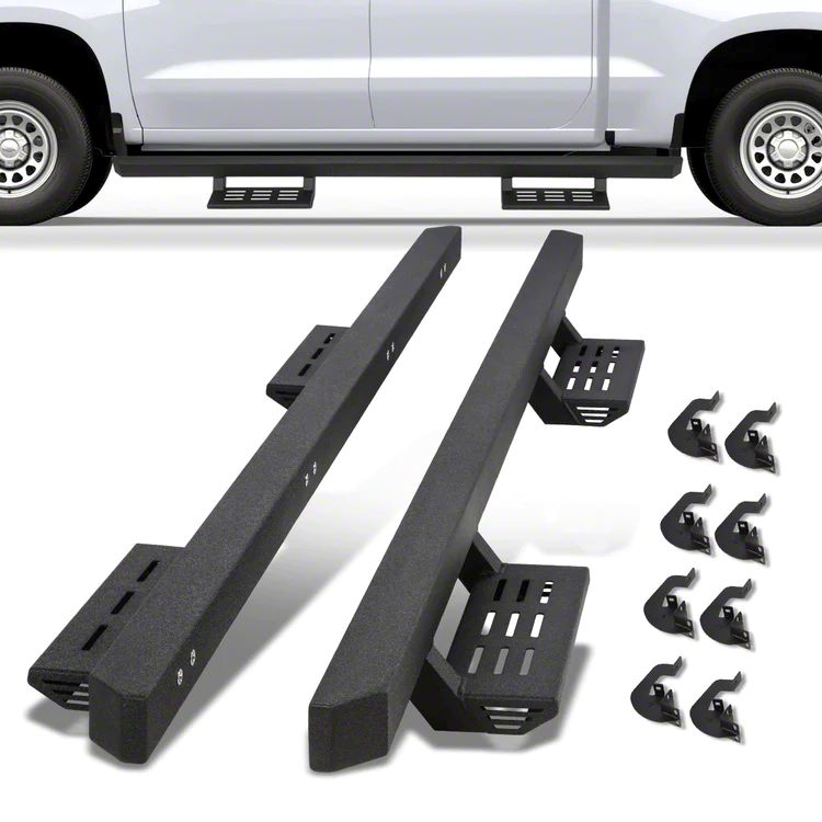 Construction and Appearance. Made from high-strength steel, these running boards are built to last, with a black Powder-coated finish that resists corrosion and adds a sleek, metallic look to your truck. The non-slip surface ensures stability, even in wet conditions.