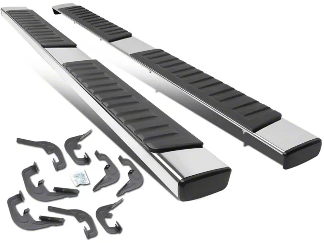 Heavy-Duty Construction. These Running Boards are manufactured from heavy-duty stainless steel for superior strength and durability. These Running Boards are then completed in a bright, mirror polished finish for classic good looks and long lasting corrosion resistance. As part of the final assembly a set of rugged, high grip, non-slip step pads are installed.