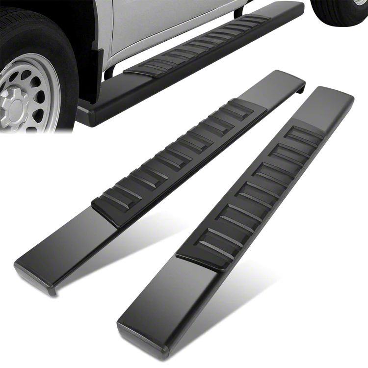 Construction and Appearance. Manufactured from durable aluminum, these running boards are designed for long-lasting rust resistance. They feature a sleek black powder-coat finish and raised textured step pads to improve traction and stability.