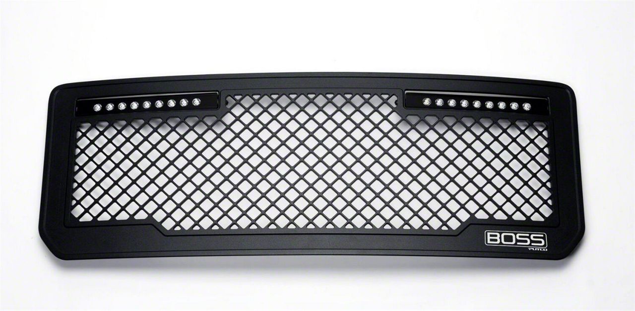 Construction and Appearance. This Putco Boss Mesh Upper Grille Insert with 10-Inch LED Light Bars is fabricated from quarter-inch, CNC-machined aluminum, which is lightweight, but plenty strong. The mesh design looks especially awesome in black and the grille insert was made in the USA.