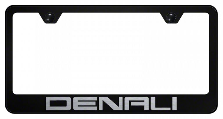 Sleek License Plate Accent. Add an element of style to your Sierra 2500’s license plate with this Denali Laser Etched License Plate Frame in Black. This license plate frame is contoured perfectly to your license plate and features an all-black color scheme and the Denali logo laser etched on its lower border. These design elements come together to give your license plate a fierce new style that complements your truck’s style. Moreover, this frame’s all stainless steel build makes it tough enough to provide added protection against impacts.