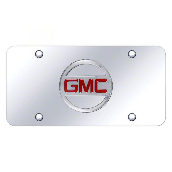 Construction and Appearance. This GMC License Plate is made of stainless steel with a chrome finish. The name plate features the circular GMC logo with "GMC" written in red on a chrome plate. It's constructed in the USA and has vehicle-specific hardware and theft-deterrent caps.