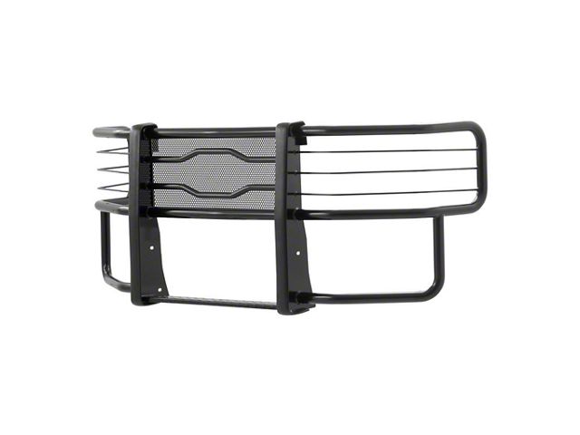 Construction and Appearance. This grille guard is crafted from durable 1-piece 2-inch steel tubing, ensuring resilience and longevity. It features a heavy-gauge steel punched center screen and is finished with an E-coating and a black powder coat for enhanced corrosion resistance and a sleek appearance.