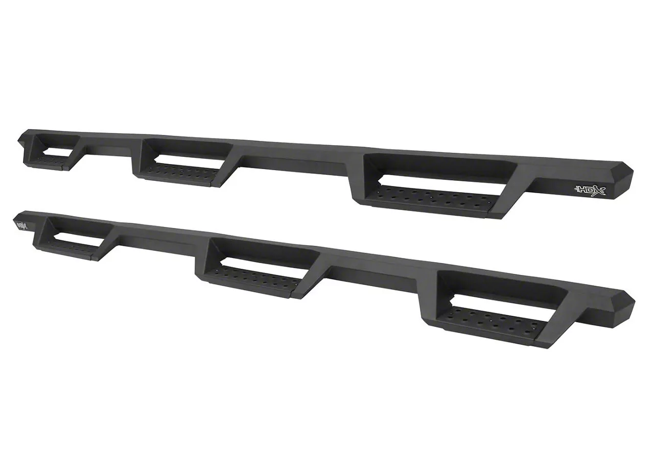 Durable Construction. These HDX Side Step Bars are manufactured from heavy duty steel plate, for superior strength and rigidity. Even if hit by road or trail debris, these Side Step Bars won’t easily bend or deform. These Side Steps are then powder coated in a textured black finish for excellent durability and long lasting corrosion resistance. As part of the final assembly a set of rugged non-slip step pads are installed.